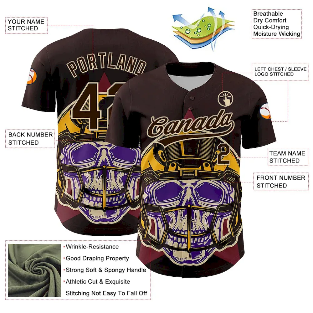 Custom Brown Cream 3D Pattern Design Football Skull Helmet Authentic Baseball Jersey