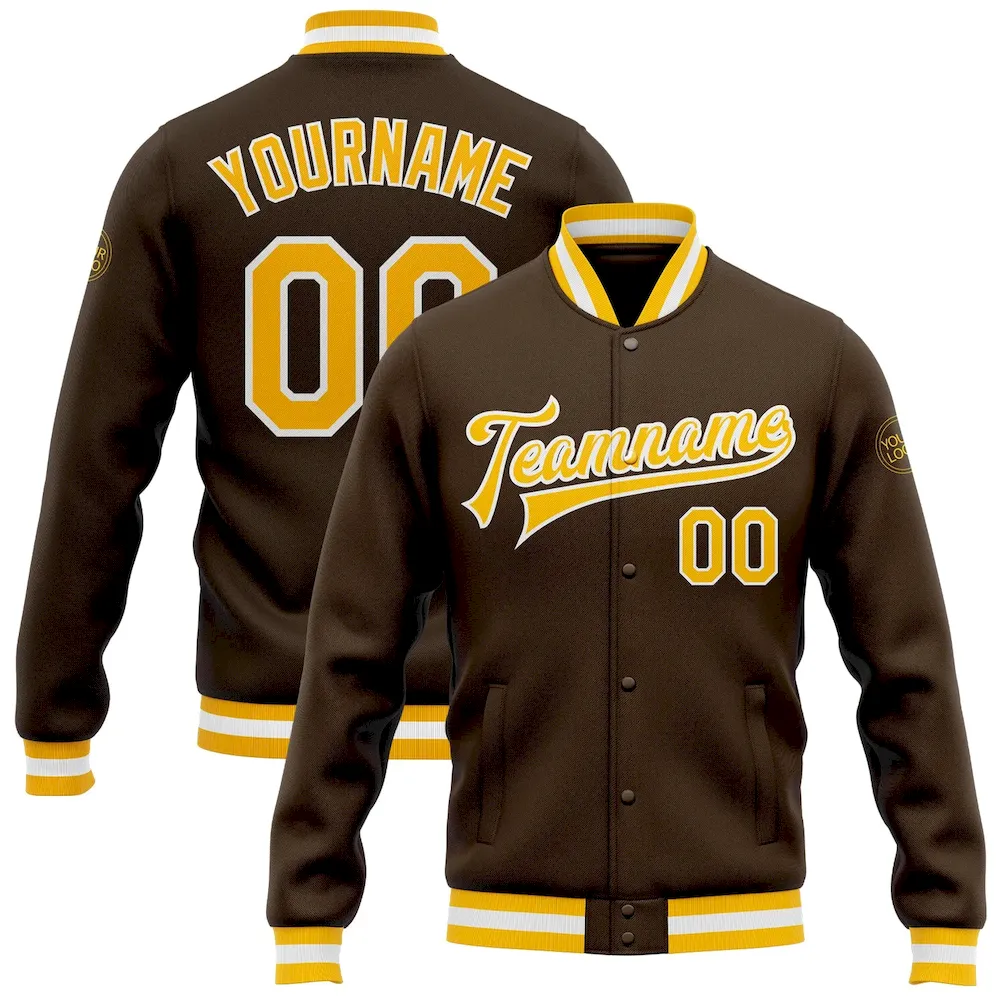 SKU: Custom-Brown-GoldWhite-Bomber-FullSnap-Varsity-Letterman-Jacket Categories: , Tags: ,